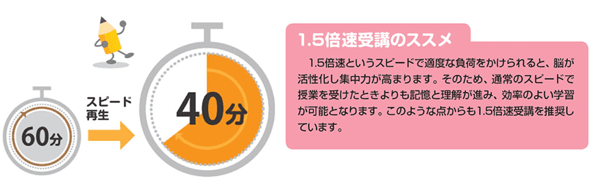 高速学習 HIGH-SPEED LEARNING 東進中学NET > 高速学習 3カ月で1年分の授業も受講可能! 東進は全ての授業を映像化しているため、授業を個別に受講することができます。自由自在なカリキュラムで学習を進められるので、今日は第1講、明日は第2講…と、毎日集中して勉強すれば、1年分の授業も3カ月で修了できます。 君の学習意欲に応じて、週2回、3回とどんどん学習を進めてOK。得意分野は一気に高校の範囲まで進めてしまいましょう。 1.5倍速で時間を有効活用 授業の映像は、音声が音飛びしない状態で1.5倍のスピード再生が可能です。 1.5倍速で60分の授業を受講した場合、40分で講義が終了。残り時間をより有効に活用できます。わからない箇所をもう一度聞いたり、演習問題を解いたりと、学習の密度を高めます。